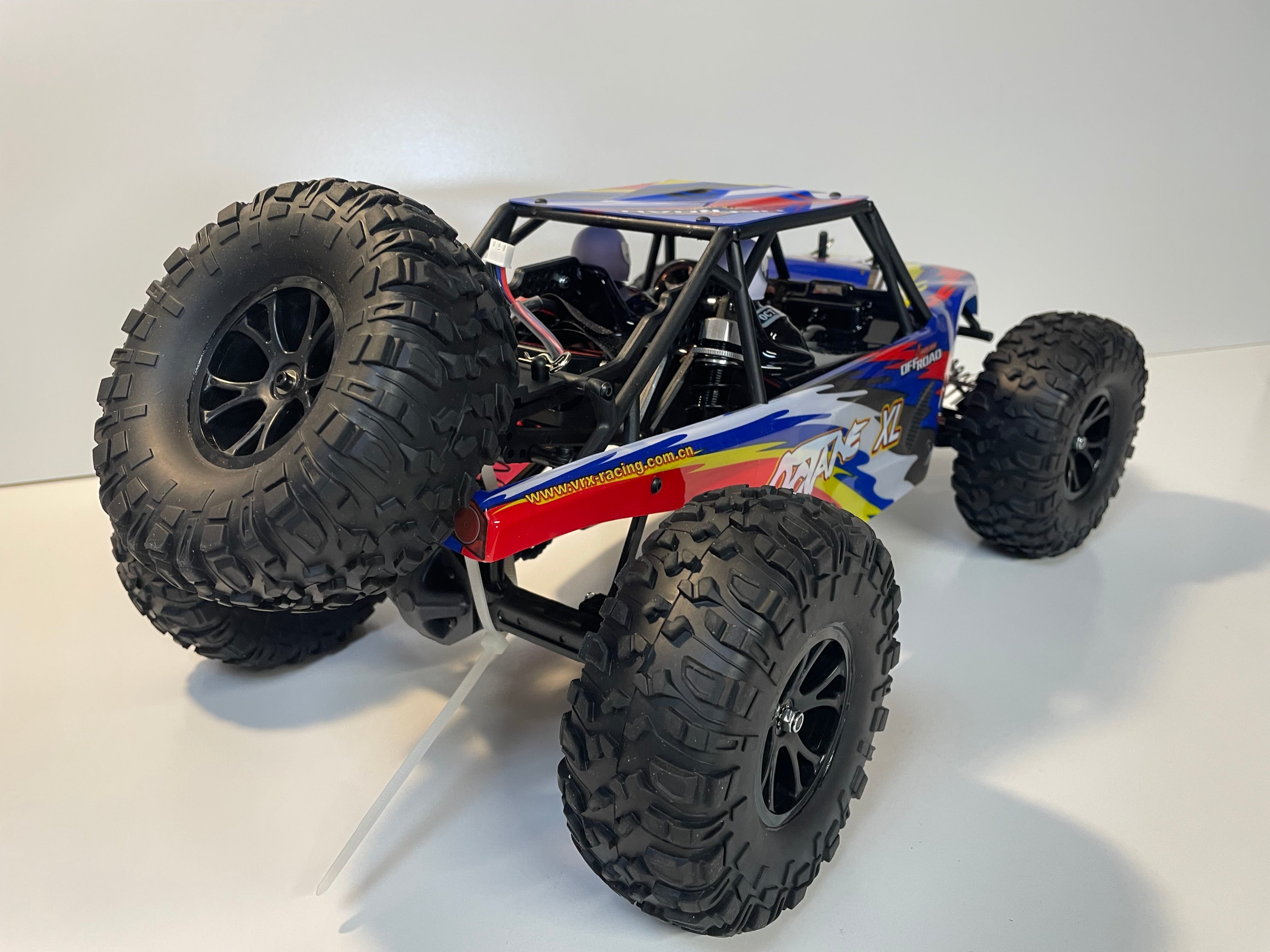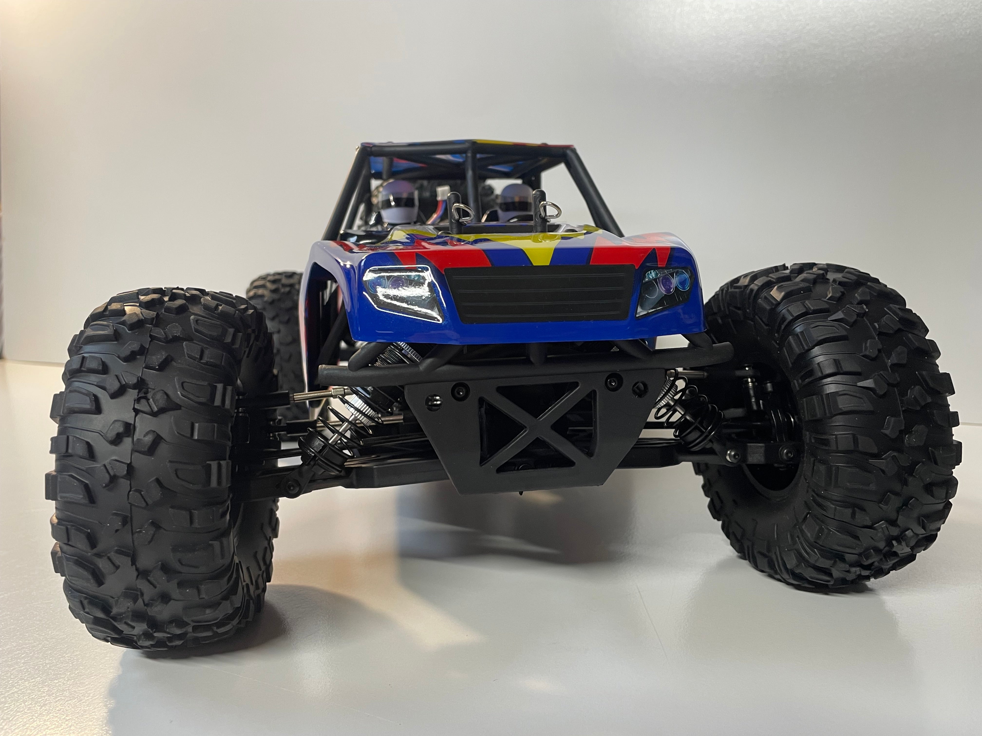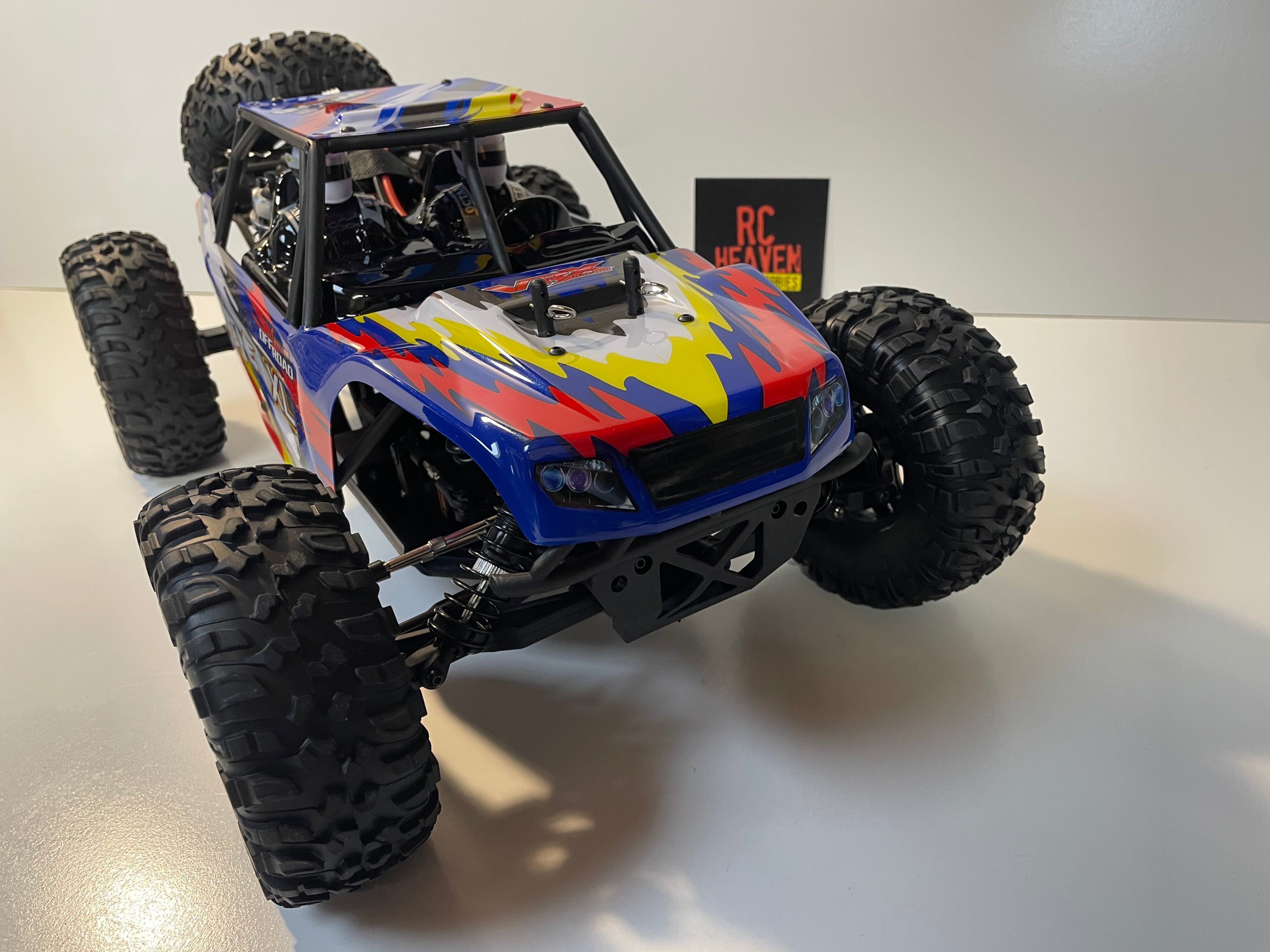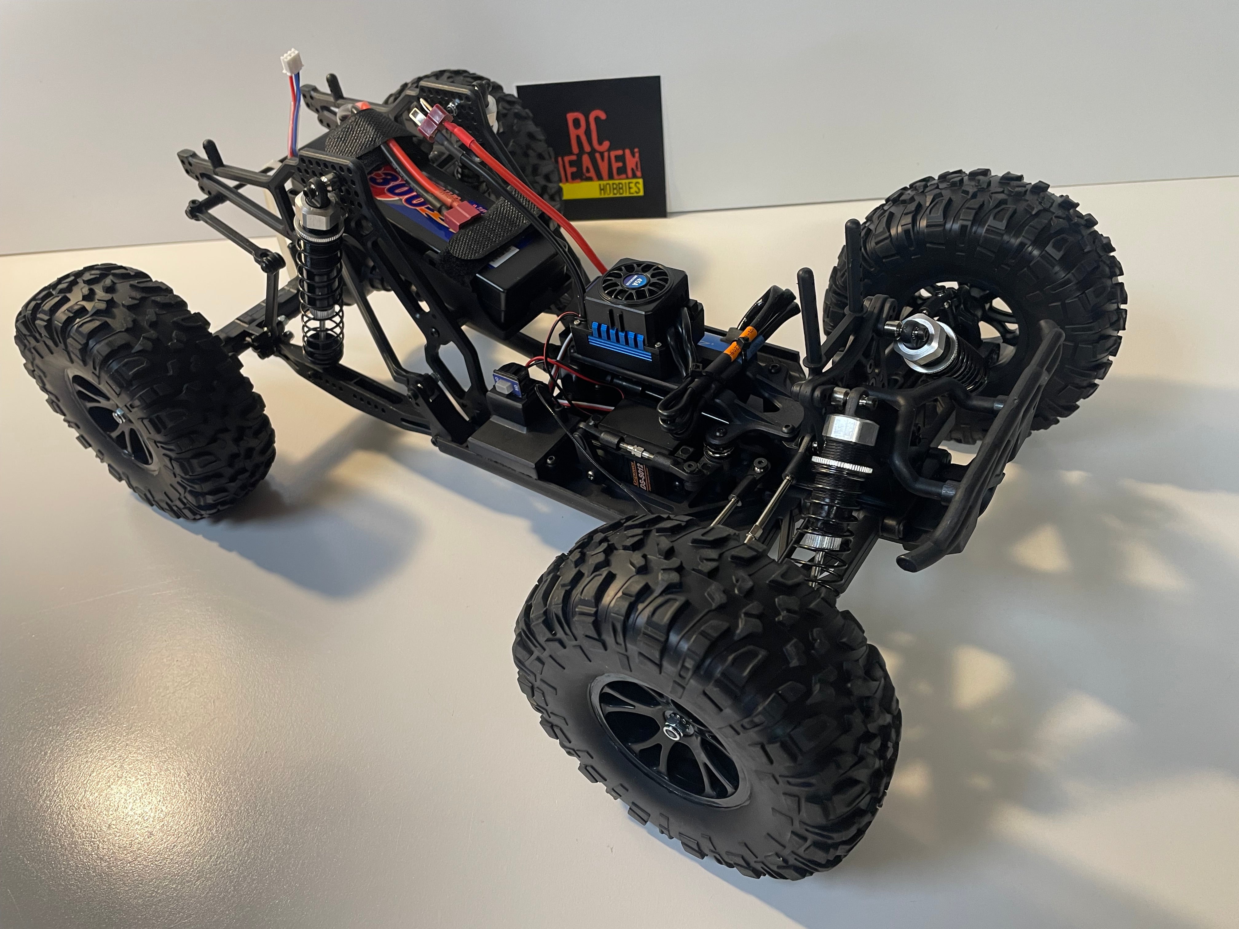 It has a high clearance and can be used as an RC Crawler. Equipped with 4 Wheel Shaft Drive, front and rear axle design, fully sealed transmission and big bored long droop shocks will enable this monster truck to go over any terrain you put in front of it.